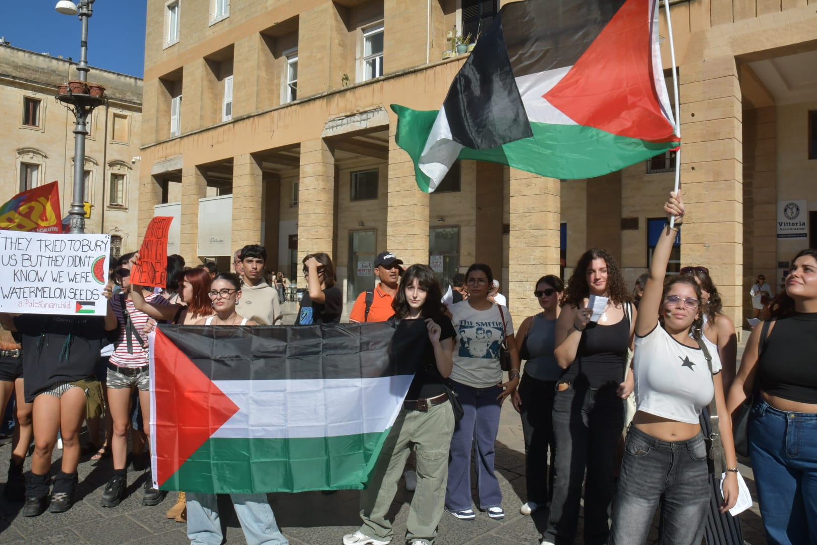 La bandiera della Palestina ha sventolato in piazza della Vittoria, a Taranto, insieme a cortei in oltre 60 città italiane. «Blocchiamo tutto": questo lo slogan che ha accompagnato la manifestazione organizzata dai sindacati di base, tra solidarietà al popolo palestinese e denuncia delle "scelte scellerate del governo israeliano e dell’atteggiamento complice di quello italiano». Prima un corteo con striscioni, slogan e bandiere, poi il presidio in piazza della Vittoria e l'intervento degli attivisti. Alla mobilitazione hanno partecipato studenti delle scuole Calò, Aristosseno e Salvemini, universitari, lavoratrici e lavoratori in sciopero.