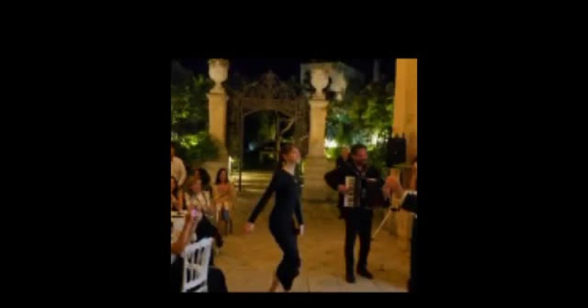 LECCE - Timofej Andrijashenko e Nicoletta Manni «pizzicati» dalla Taranta: i due celebri ballerini sono stati immortalati in questa danza sfrenata durante la cerimonia nel cinquecentesco Palazzo Tamborino-Cezzi di Lecce, in occasione del premio «Donna dell'anno» conferito all'étoile internazionale della danza, prima ballerina della Scala di Milano, dalla sezione Ande di Lecce, presieduta da Maria Luisa Morroy Capasa.