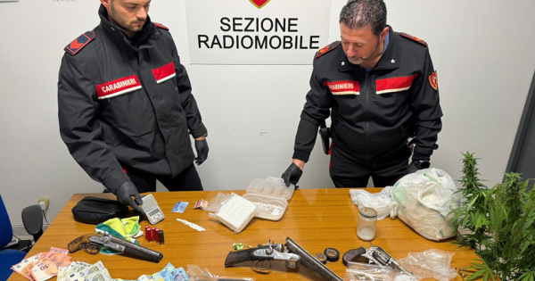 Durante un controllo di routine su un’auto, i militari hanno notato l’evidente nervosismo dei due occupanti. La perquisizione immediata ha confermato i sospetti: all’interno del veicolo sono stati rinvenuti circa 0,60 grammi di cocaina, già suddivisa in tre dosi, e 930 euro in contanti, ritenuti provento di una possibile attività di spaccio. Gli accertamenti si sono poi estesi alle abitazioni dei due uomini, entrambe a Veglie, svelando un quadro ben più ampio. In una prima casa sono stati rinvenuti circa 6 grammi di cocaina, bilancini di precisione, materiale per il confezionamento. Nella seconda abitazione, invece, i militari dell'Arma hanno rinvenuto e sequestrato un vero e proprio arsenale: un fucile a canne mozze, una pistola, un revolver con matricola abrasa, numerose cartucce di vario calibro e due piante di marijuana alte circa un metro, in piena infiorescenza.