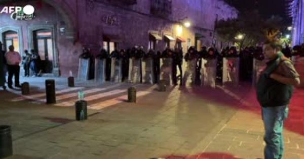 Gli agenti in tenuta anti-sommossa presidiano il palazzo del governo dello Stato di Michoaca'n