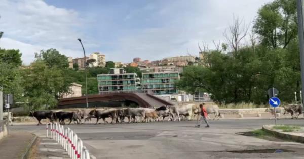 Potenza - Vacche a spasso in viale del Basento di buon mattino. Una scena bucolica che non poteva non attirare l'attenzione degli automobilisti di passaggio. Una piccola scena rurale lungo la trafficata arteria che serve uffici pubblici e attività commerciali, in quell'area dove la città si salda alla campagna.