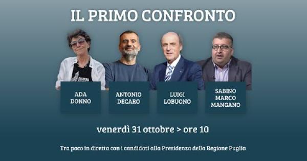 È organizzato dalla Gazzetta del Mezzogiorno il primo dibattito a cui prendono parte tutti e quattro i candidati presidenti della Regione Puglia: (in ordine alfabetico) Antonio Decaro, Ada Donno, Luigi Lobuono e Sabino Marco Mangano, che si confrontano sui temi della campagna elettorale e sulle prospettive della politica e dell’economia pugliesi a 24 giorni dal voto. Un’occasione per misurare il polso dei candidati rispetto alle questioni che saranno al centro delle dichiarazioni (e delle polemiche) dei giorni che condurranno alle urne.