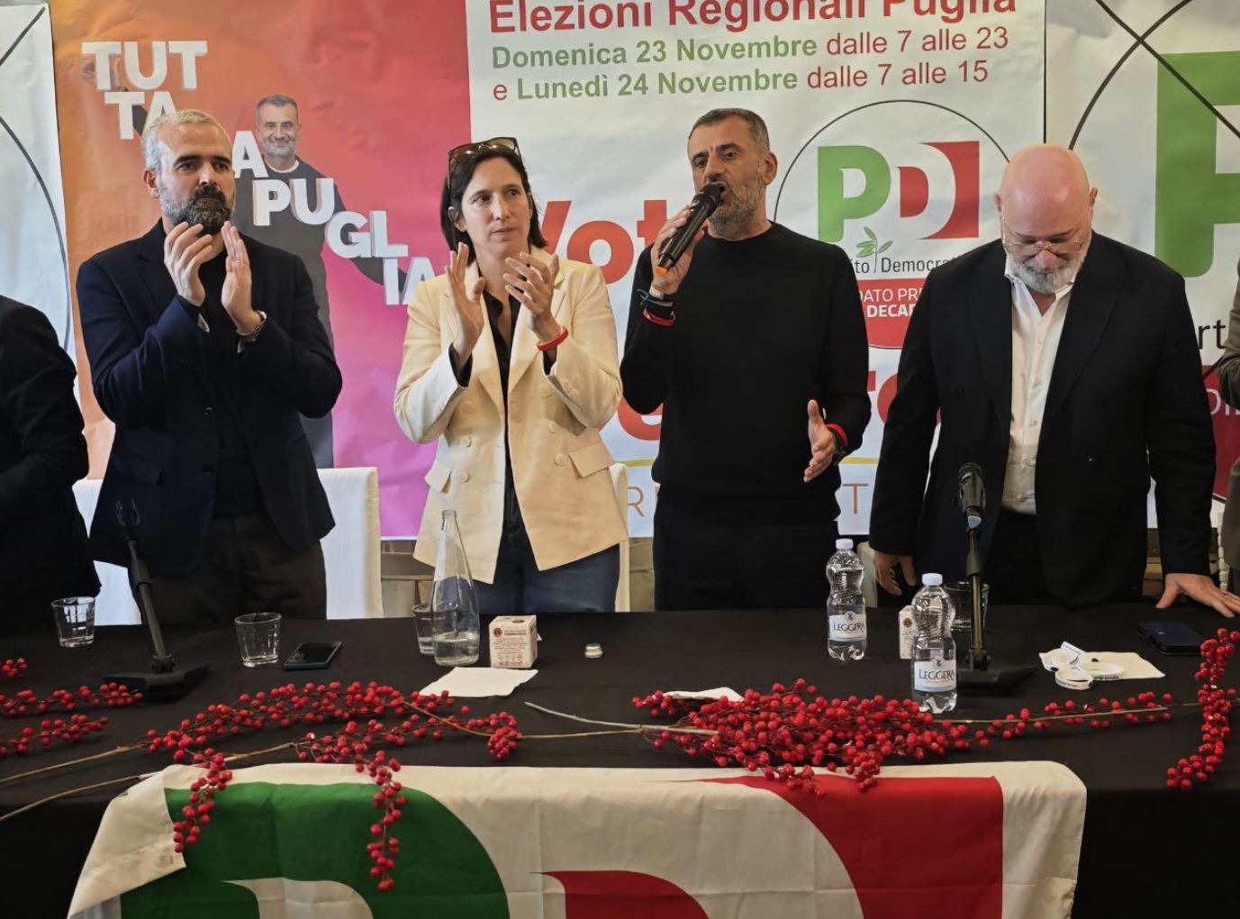 «Sono felice di essere di nuovo in Puglia per sostenere la corsa di Antonio Decaro, un bravissimo amministratore, una persona che saprà mettere al centro la sanità pubblica, il lavoro dignitoso, e le opportunità per i giovani pugliesi». Lo ha detto la segretaria del Partito democratico, Elly Schlein, a margine di un appuntamento elettorale a Barletta a sostegno del candidato governatore pugliese del centrosinistra Antonio Decaro. Schlein, accompagnata dal presidente del partito, Stefano Bonaccini, oggi partecipa a tre appuntamenti a Barletta e Foggia e concluderà nel pomeriggio a Bari.