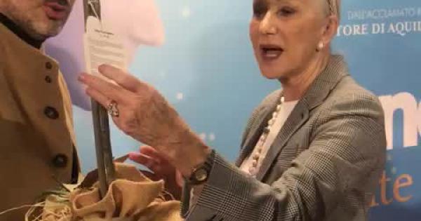 TRICASE - Helen Mirren riceve in dono un alberello di olivo nella hall del cinema Moderno di Tricase, in occasione della “prima” del suo nuovo film “Wonder White Bird”. “Lo pianterò subito nel giardino della mia masseria di Tiggiano accanto a tutti gli altri”, ha detto l’attrice Premio Oscar per l’interpretazione della Regina Elisabetta II nel film “The Queen”. Ricevuta dal prefetto di Lecce, Luca Rotondi, l'attrice ha seguito dalla prima fila, la proiezione del film.
