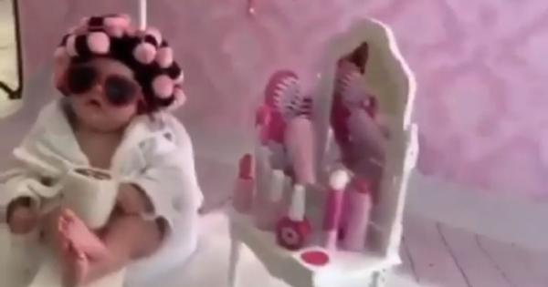 Il messaggio è accompagnato da un video in cui si vede una neonata seduta rilassata in accappatoio, occhiali da sole a forma di cuore e bigodini rosa in testa.