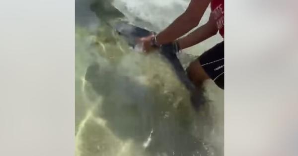 Sotto gli occhi increduli dei bagnanti, il piccolo cetaceo è stato aiutato a guadagnare il largo dal personale del lido: con non poca difficoltà i bagnini hanno guidato il delfino fino a fargli raggiungere acque più profonde, tra gli applausi scroscianti dei presenti.