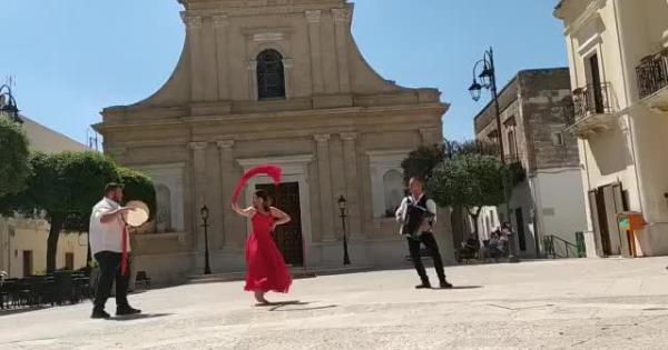Nel Comune del Tarantino una ballerina e due musicisti si dilettano a suon di passi di danza e tamburello