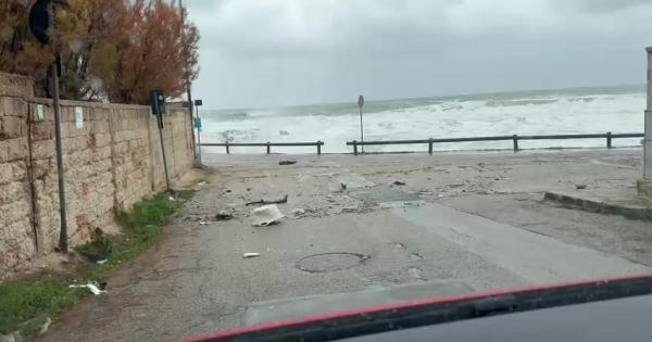 La potenza delle onde ha distrutto muretti e interrotto la circolazione sulla strada invasa da pietre e montagne di schiuma. Danni anche a residenze private.