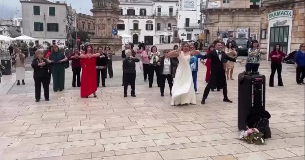Altro che riso e foto davanti alla chiesa: a Ostuni il matrimonio si festeggia a ritmo di flash mob. Gli sposi, appena usciti dalla cerimonia, hanno guidato amici e parenti in una coreografia improvvisata sulle note di “Per sempre sì” di Sal Da Vinci, vincitore dell’ultimo Festival di Sanremo, direttamente in piazza.